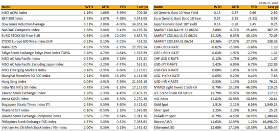 Macroeconomic data this week started to show the impact the Russia-Ukraine conflict was having on the economic outlook. Flash PMI came in better than expected, but the pace of expansion fell to a two-month low with the composite reading at 54.5 in March versus prior 55.5. Russia’s invasion of Ukraine offset the boost to demand from the reopening of economies after the lifting of Covid measures, supply chain delays hit the highest level since November and companies’ costs hit a new record high.