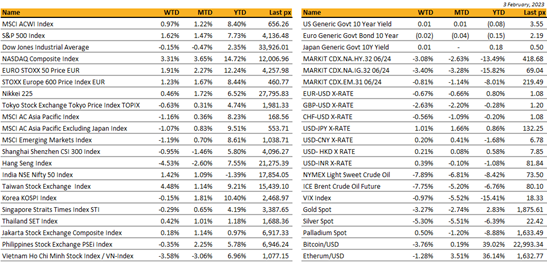 The Fed has made it clear that they want to see evidence that imbalances in the labor market start to improve – recognizing that labor is a lagging economic indicator, and probably won’t accelerate their tightening pace due to this one report. On Wednesday, the Fed hiked rates by an anticipated 25 bps to 4.50%-4.75%. Chair Powell acknowledged that the disinflation process had started, which gave risk assets a boost. He also said that policy makers expect to deliver a couple more interest –rate increases before putting their aggressive tightening campaign on hold. There were no dot plot forecasts at the press conference but SF Fed President Daly on Fox Business Friday said that officials’ December projections of 5.1% at the end of 2023 were “a good indicator of where policy is at least headed”.
