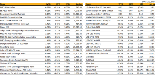 MSCI Asia index took a beating last week, down 2.2%. With the exception of TOPIX, NIFTY, Vietnam most Asian country indices were negative. China reopening rally continues to unwind with HSI down 2.22%, and CSI 300 down 1.75%. Correction was driven in large part by losses in previously outperforming tech and property shares. Strategists however remain bullish on longer-term outlook, though point to confirmation of an earnings recovery, and policy support announcements at March congress as potential catalysts. Goldman strategists see 24% increase in MSCI China index by year end.