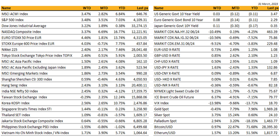 US markets ended March on a high on optimism that rate hikes by the Fed will end soon as economic data continued to point to cooling inflation. The Fed’s preferred inflation gauge, the PCE deflator showed price growth eased last month to 0.3% against views of 0.4% whilst the YoY rate came in at 4.6% versus expectations of 4.7%. This reading follows lower than expected CPI and PPI data released earlier in the month. A lower personal spending and a slowdown in personal income growth data fueled further expectations of a cooling inflation outlook. The U. of Mich. 1 Yr inflation expectation fell to 3.6% from 3.8% previously. Whilst this disinflation-train continue to buoy markets, skeptics are just as plenty with prominent money managers choosing not to chase the rally calling the expectations for easier Fed monetary policy are overblown with inflation still running hot. “Should any cuts come, they would be intended to halt an economic downturn that also would bode poorly for equity returns”, the thinking goes. Regardless, risk sentiment returned with the VIX closing below 19 on Friday. Concerns surrounding the last couple of weeks’ banking failures and liquidity crises eased following reports that the Fed Reserve’s lending to the banking sector declined by some $11 bln for the week to $153 bln.