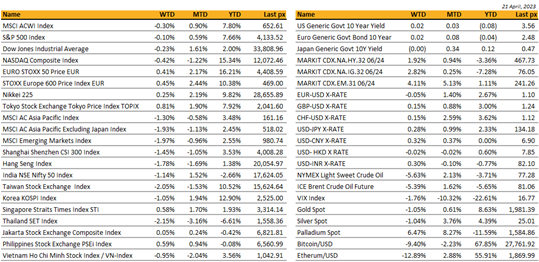 US markets closed the week relatively flat as it wades its way through mixed earnings reports and Fed-speak. April so far, is seeing markets consolidate following March’s turbulent regional banks turmoil. Big Tech, which has been powering the year’s performance in the Nasdaq and are heavyweights in the S&P 500, will report its earnings this week. So far, albeit early days yet, 77% of S&P 500 companies that have reported, beat estimates. The VIX closed at 2021 levels, at 16.77. Some mixed data releases added to angst about the path of rate hikes, with the purchasing managers’ index unexpectedly climbing to a near one-year high threatening to reignite inflationary pressures. All 3 components of manufacturing, services and composite measures beat expectations. Geopolitical tensions remain, this time from Biden reportedly aiming to sign an executive order in coming weeks, to limit US businesses’ investment in key parts of China’s economy.