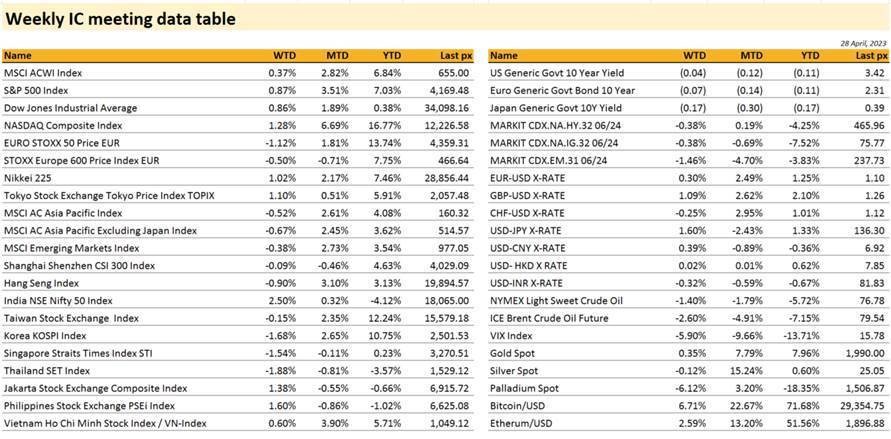 US markets closed the week relatively flat as it wades its way through mixed earnings reports and Fed-speak. April so far, is seeing markets consolidate following March’s turbulent regional banks turmoil. Big Tech, which has been powering the year’s performance in the Nasdaq and are heavyweights in the S&P 500, will report its earnings this week. So far, albeit early days yet, 77% of S&P 500 companies that have reported, beat estimates. The VIX closed at 2021 levels, at 16.77. Some mixed data releases added to angst about the path of rate hikes, with the purchasing managers’ index unexpectedly climbing to a near one-year high threatening to reignite inflationary pressures. All 3 components of manufacturing, services and composite measures beat expectations. Geopolitical tensions remain, this time from Biden reportedly aiming to sign an executive order in coming weeks, to limit US businesses’ investment in key