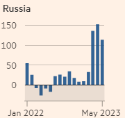 Higher interest rates are hampering global demand, leading the country’s exports and imports to shrink last month compared to a year before. China’s trade with the US fell 5.5 per cent during the first five months of 2023 compared with a year earlier, with its trade surplus with the world’s largest economy dropping 14.5 per cent. Trade with Japan declined 3.5 per cent year on year. Trade with Russia however more than doubled in May.