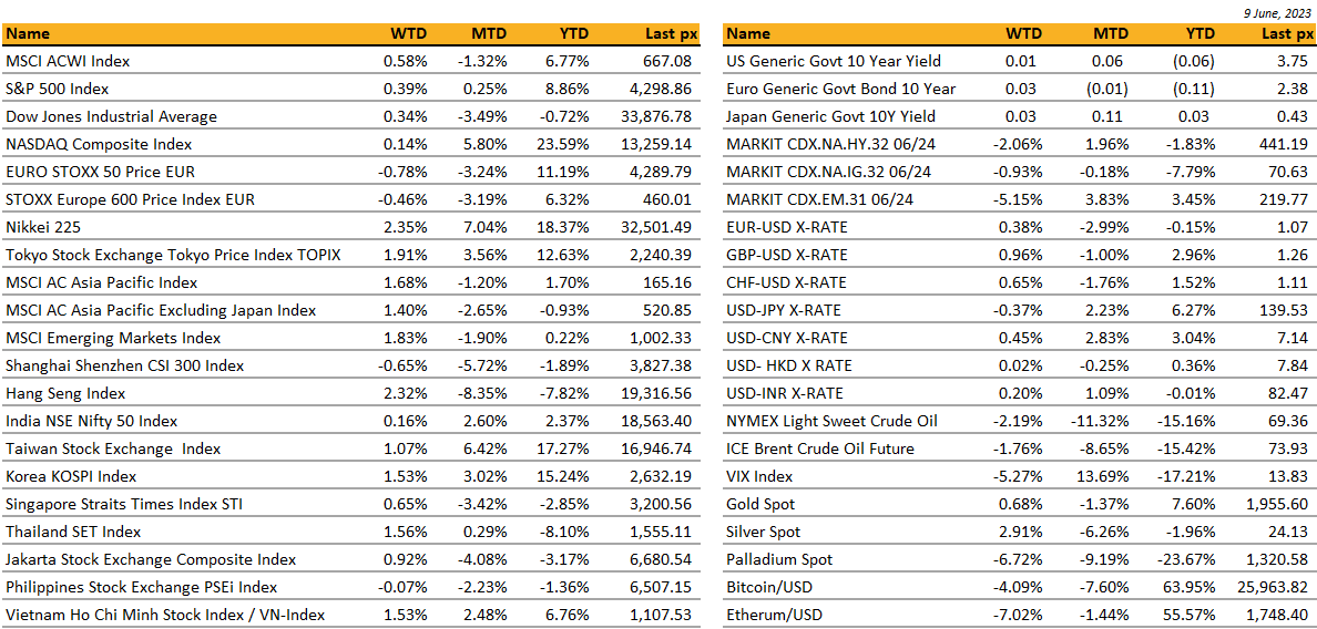 Tech continued to be the main tailwind behind the market’s positive performance with AI stocks outperforming. Tesla had a good day in the sun once again after its Model 3 sedans became eligible for a full US tax credit set by the US Treasury Dept and General Motors announcing that it would adapt its electric vehicles to Tesla’s superchargers. Yet, strategists remain divided with Technicians calling for a continued rally in the S&P 500 while others reiterated their bearish outlook when viewed more through a global lens. “The worry is how fast it’s risen and the concentration within a select few names. A pullback at the top wouldn’t be too much of a surprise as markets take a breather.” Talks of possible hike in July after June’s expected pause, brought on by unexpected hikes in Australia and Canada kept bulls at bay. This coming week’s CP data and subsequent FOMC will give us more clarity on the Fed’s path.