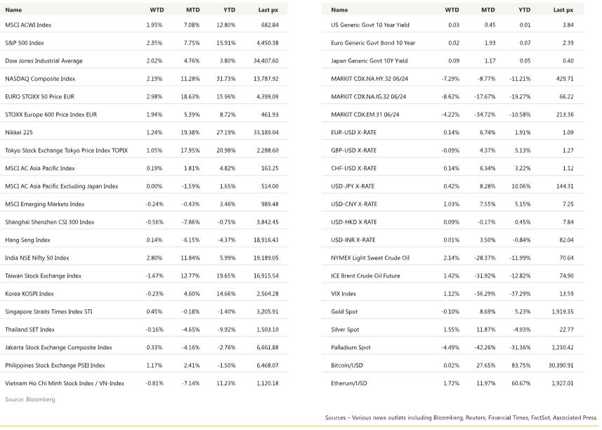 However, the Labour Dept data showed that US jobless claims fell last week by the most since 2021 and the third estimate of Q1 GDP was revised up to a 2% annual rate from 1.3% previously. This week’s jobs data, out Friday would likely affirm Powell’s rhetoric to raise the Fed Funds by another 25 bps. Both the UST10’s and the 2’s yielded some 12 bps higher for the week. Powell also said a recession is not the most likely scenarios the economy remains fairly resilient. The start of Q2 earnings and the next Fed July policy meeting will now be in focus. Headwinds are brewing on the horizon as Washington may further tighten restrictions on chip exports to China, potentially denting sales in the world’s top semiconductor market. Bitcoin continue to hover around its pivot level of $30k whilst Ether did better at $1900, even as Biden calls to eliminate crypto tax loopholes. So called BTC whales and sharks reportedly, consistently accumulated the token after analysts had called for a July recovery.