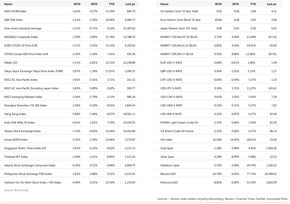 Early last week, global government bonds printed in the red, confronted with headwinds in the form of strong UK wages data, robust US retail sales, and a re-acceleration in Canadian CPI, whilst European natural gas prices (+13%) saw a fresh spike amidst a strike at an Australian LNG facility. Within the rates space, the intraday range was wide. While a firm retail sales print pushed 2Y yields above 5% briefly, the subsequent risk off drove yields as low as 4.90%.