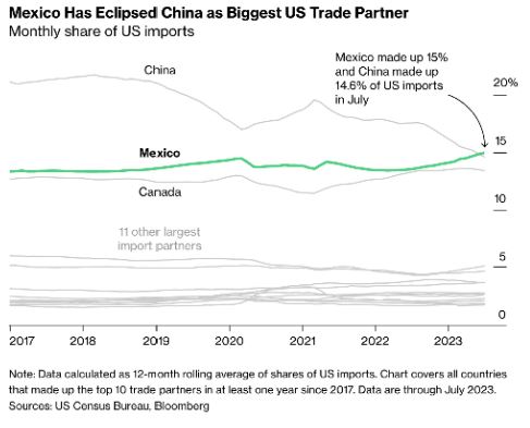 An interesting point to share, the de-globalisation or the cost of reshoring supply chains domestically or close to home that many economists are talking about, one of the main beneficiaries from the shift away from China, in regards of the US, is Mexico.