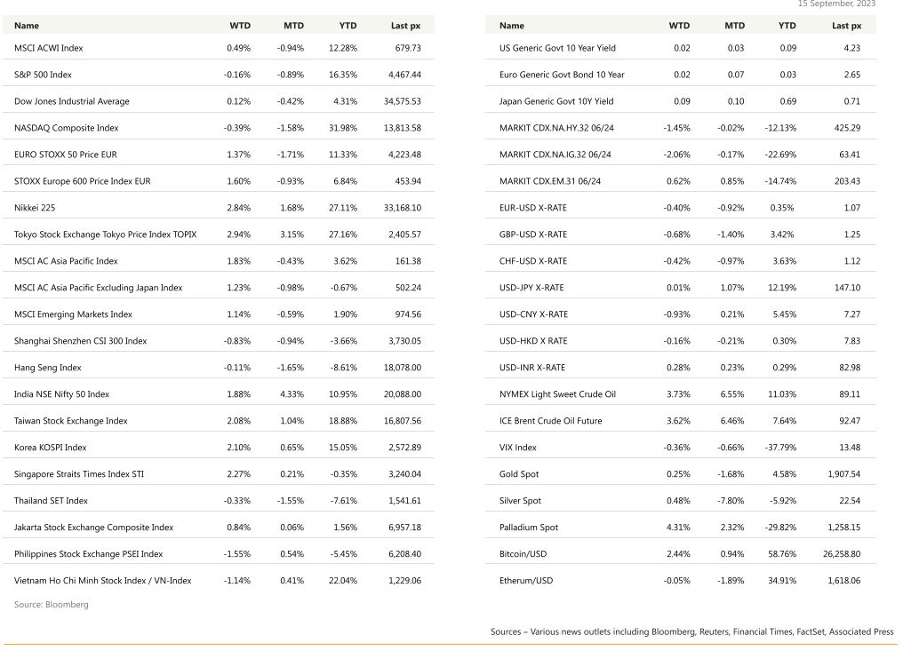 Strong credit data published on Monday in China showed recent steps to bolster the real estate market may be starting to lift household demand for mortgages, while corporate loans also picked up. CPI data returned to gains after a drop in July, while factory-gate deflation also narrowed. Mainland markets were lifted by the series of encouraging news.’ The People’s Bank of China said it would cut the reserve requirement ratio (RRR) for yuan deposits by 0.25 percentage points, to 7.4 per cent, effective Friday. It is the second such cut this year. China’s yuan has lost more than 5% of its value against the dollar so far this year to become one of Asia’s worst performing currencies for 2023. The CSI 300 index closed the week weaker by 0.83% and Hang Seng index weaker also by 0.11% despite the positive news.