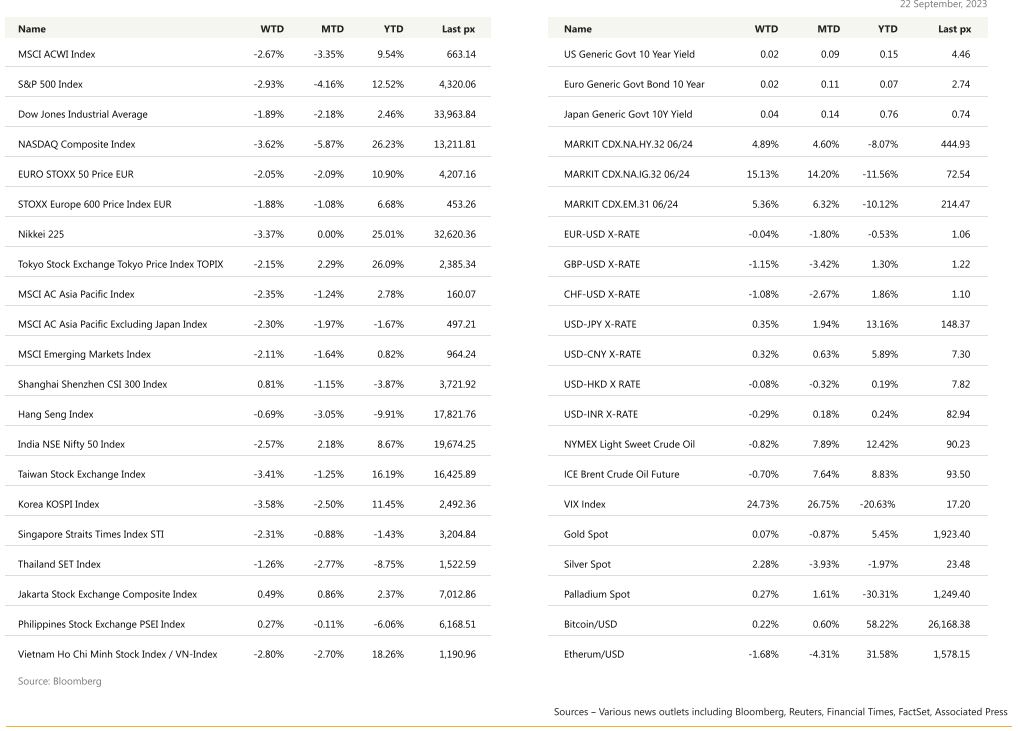 US markets endured its worst week in 6 months following the Fed’s hawkish pause statement post FOMC on Thursday. It was the weakest performance since March when fear gripped markets after the sudden collapse of Silicon Valley and Signature Banks. Tech, consumer discretionary and financials bore the brunt of the selloff. Elevated crude prices at WTI$90 pb didn’t help either. Pockets of Tech bucked the trend with Activision Blizzard Inc. shares gaining Microsoft Corp.’s $69 billion acquisition of the gaming company looked set to clear its final regulatory hurdle.