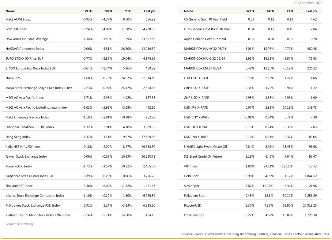 US markets continued its down streak posting its biggest monthly drop of 2023, and the worst quarter since September 2022 on concerns about the Fed Reserve’s policy path in spite of signs of cooling in a key inflation gauge. The Fed’s preferred measure of underlying inflation pressures, the PCE Deflator, rose at the slowest monthly pace since late 2020, while consumer spending edged up. Core PCE Deflator MoM fell to 0.1% from 0.2% (below expectations) and YoY fell to 3.9% from 4.2% (as expected). Headline PCE which includes volatile food & energy prices came in as expected at 3.5% from a revised 3.4% last month. Personal spending and consumption held up although below expectations indicating the consumer continues to spend. US initial jobless claims showed some tightness in the labor market, with the number of new filings edging up slightly to 204,000 last week supporting consumption. However, with the recently expired student loan holiday and rising energy prices, we expect some of this discretionary spending to crimp. NY Fed’s Williams said the central bank is at or near its peak level of interest rates, though policymakers would keep them high for “some time” to bring inflation down to the central bank’s 2% goal – this was the kicker that sent shares lower in the latter half of Friday. Other Fedspeak included Fed Chicago’s President Austan Goolsbee who said policymakers shouldn’t place too much weight on the traditional economic idea that steep job losses are needed to quell inflation, which he said could lead officials to raising rates too high. Richmond’s Barkin said it’s too soon to know if another rate increase will be needed. Other data of interest was the U. of Mich. Inflation expectations which came in as expected at 3.2% and 2.8% for the 1 year and 5-10 year categories respectively, in spite of higher oil prices. The final GDP annualised release came in at 2.1% – no recession just yet perhaps.