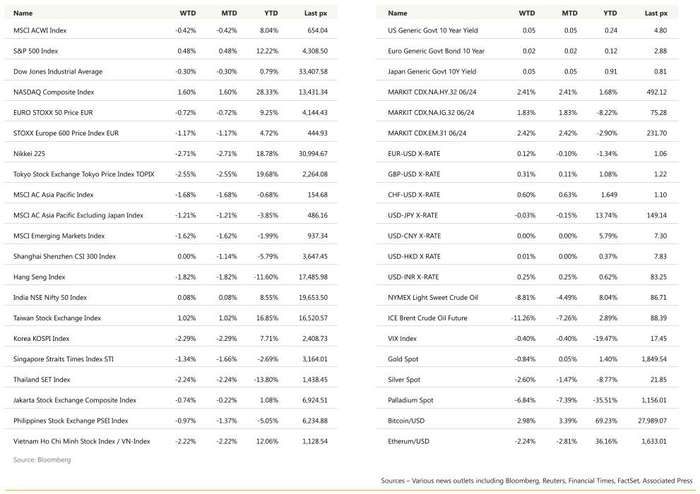The UST10Y yields tested 4.88% steepening to its highest against the UST2 s since October of last year, at -28 bps. Underpinning this resilience is a view that the economy remains strong enough for financial markets to withstand higher borrowing costs. Should the reason for higher yields be because we have a resilient economy and a strong labour market, then that would likely drive revenues and earnings growth and ultimately be a positive for markets.