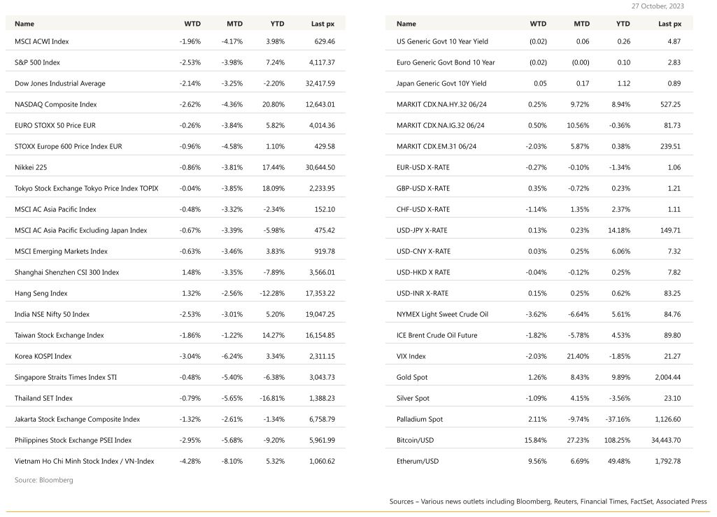 The S&P 500 entered a technical correction on Friday after closing some 10% below its recent peak. The Nasdaq which crossed the said 10% line earlier, rebounded on Friday, helped by better-thanexpected results from Amazon. Earlier in the week, Google disappointed with its results reporting a smaller than expected profit for its Cloud unit exacerbating concerns that, “If tech disappoints, it’s hard to see what drives equities higher in the near term,” said a strategist. CBOE’s VIX closed above 21. Clearly, data releases once again supported the narrative of good news is bad, such as consumer spending outpacing forecasts in September, underscoring the recent strength in the economy. GDP expanded at a better than expected 4.9% rate for the third quarter, while economists expected 4.5% growth. In addition, near-term inflation views rose to a five-month high of 4.2% from 3.8%, data from a University of Michigan sentiment survey showed Friday. Gold rose to breach $2,000 an oz as tension in the Middle East escalated and inflationary pressures remained. 10-year US Treasury yields came off the boiler of 5% plus after the release of weaker-thanexpected U.S. inflation price and disposable income data earlier, and crude oil slipped after a rise in US crude stockpiles and a stronger USD. UST10’s and 2’s are at 4.83% and 5.00% respectively.
