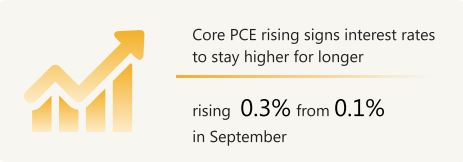 The number we were all looking out for, the PCE deflator, came in a tad higher than expected fuelling expectations further that the Fed is poised to keep interest rates higher for longer. The Fed’s preferred measure of inflation accelerated to a four-month high, core PCE rising 0.3% from 0.1% in September showing the persistent pressures that are driving the central bank to keep monetary policy tight. On the supply side, the core PCE price deflator slowed to 2.4% in Q3 versus a consensus of 2.5%, the slowest quarterly rise since Q4 2020, and a fall from 3.7% in Q2.