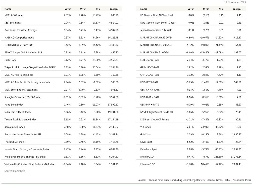 Risk appetite was boosted by the latest U.S. inflation data, which undershot expectations, signalling that an economic soft landing may be imminent and raising hopes that interest rates may have peaked. MSCI Asia closed the week higher by 3.21%.