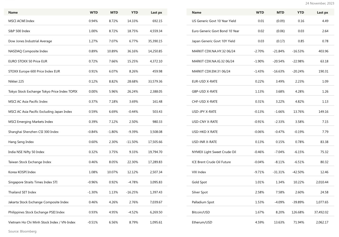 Some data points across Asia last week – Singapore’s Q3 GDP came in at +1.1% yoy vs. +0.8% yoy expected. Core inflation accelerated 3.3% in October YoY. Korea’s producer prices rose by 0.3%m/m in October, for the fourth consecutive month. While the PPI extended the rise, its monthly pace moderated from 1.0% in August and 0.5% in September. Bank Indonesia (BI) left its key policy rate unchanged at 6.00% last Thursday and likely keep it at that level until at least mid-2024. Minutes from the Reserve Bank of Australia’s (RBA) latest meeting indicated that the central bank opted to raise its key interest rate for the 13th time in the current cycle due to increased inflation risks along with stronger than expected performance of the economy. Also, the RBA Governor acknowledged that inflation will remain a crucial challenge over the next one to two years. The Australian dollar found support from the hawkish minute, +1% for last week.