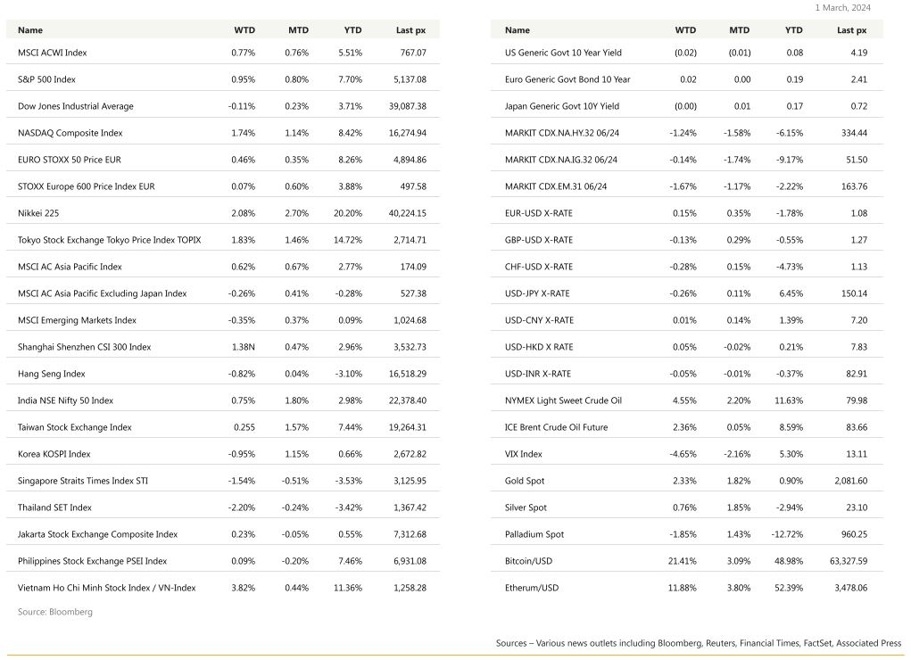 US stocks ended February with all 3 major indices notching their fourth consecutive month of gains. On the coat-tails were the mid-cap S&P 400 and small-cap Russell 2000 which also racked up consecutive monthly gains since late October last year. The S&P 500 posted muted moves for much of the week earlier, while markets awaited economic data that could provide clues to the Federal Reserve’s next moves. But following the release of the PCE core deflator, investors leaned into equities — reassured that inflation was easing enough for the central bank to eventually start cutting interest rates in the summer. Historically, February is among one of the worst months for equities, but the S&P 500 rose 5.2% for the period. The last inflation reading for the month, the PCE Index came in as expected at 2.4% which was down from last month’s 2.6%. Core came in at 2.8% from 2.9% last month. The MoM core reading came in as expected at 0.4%. The consistent easing of headline inflation, even though the pace has slowed somewhat, was enough to give risk assets the tailwind it needed to continue on its upward trajectory. Other data released underscores the economy’s continued resilience, with GDP annualised QoQ coming in at 3.2%.