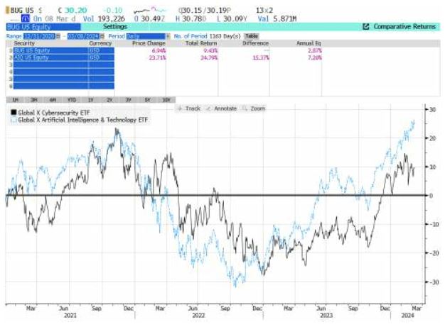 Crowdstrike’s better than expected earnings confirms to us that the sector remains very much in demand. Cyber security as an investment and acting as somewhat of a proxy to AI remains attractively priced. We are looking to add to the sector via the BUG ETF (Global X Cybersecurity ETF).