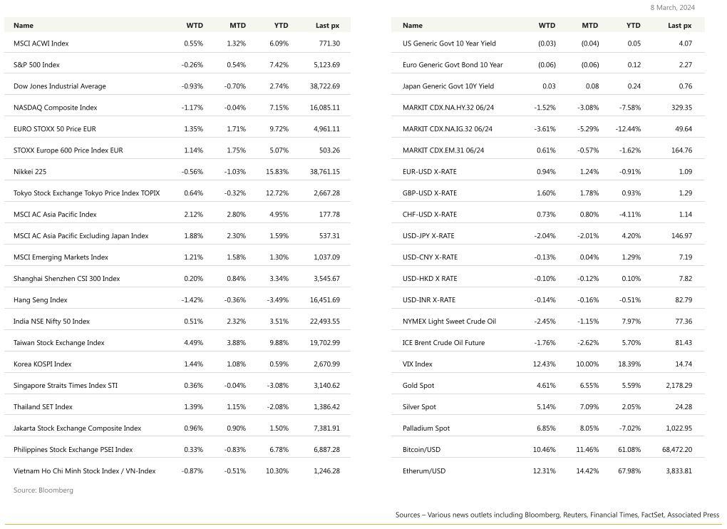 Asia markets closed the week higher, MSCI Asia ex Japan was up 1.88%. Nikkei index was lower by 0.56%. Taiwan was the best performer, helped by the chips rally, taking the index up close to 4.5% last week. The index in Taiwan is up almost 9.9% year to date now, one of the best performing markets this year, alongside Vietnam (+10.3%)