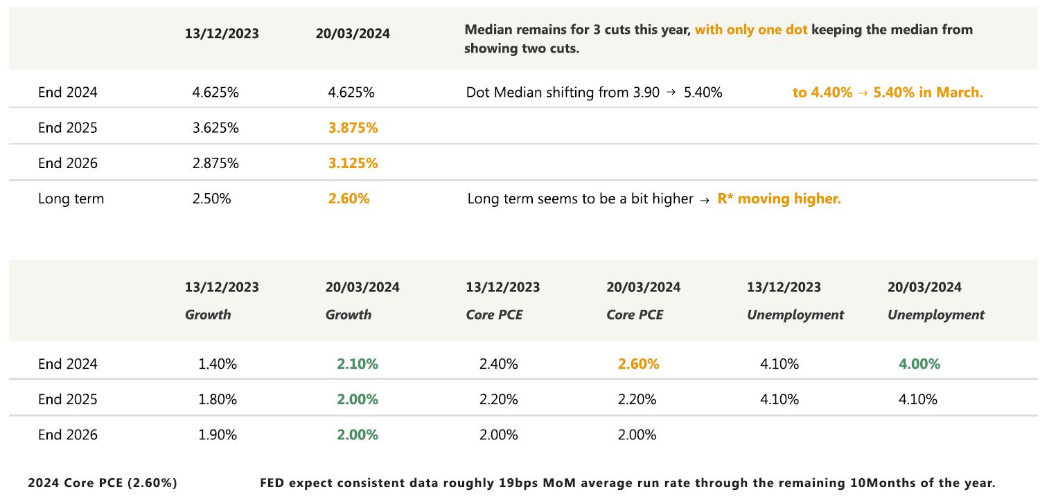 The FOMC painted an optimistic picture of the US economic outlook, as the median growth projections were marked higher throughout the forecast horizon: to 2.1% in 2024 (P: 1.4%), 2.0% in 2025 (P: 1.8%), and 2.0% in 2026 (P: 1.9%). The median unemployment rate projection was marked down to 4.0% in 2024, maintained at 4.1% in 2025, and marked down to 4.0% in 2026. Powell leaned on supply-side improvements and said, “in and of itself, strong job growth is not a reason for us to be concerned about inflation.” Additionally, Chair Powell stated that “it will be appropriate to slow the pace of run-off fairly soon.”