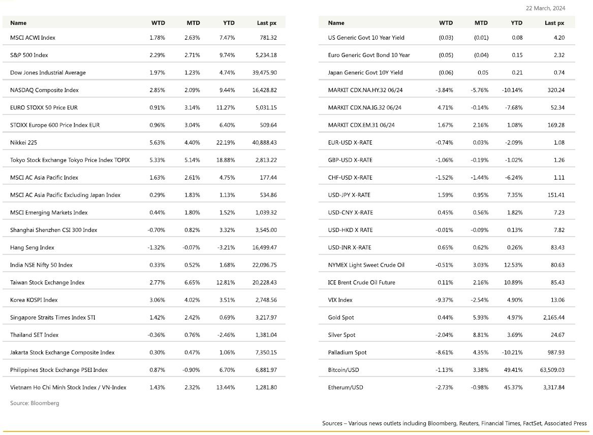Gold rose to a year-to-date high of 2222.75 intra-week after the FOMC, before falling to close the week at 2165.44 (+0.58%). The decline in the gold price towards the end of the week was driven by the fall in global yields following a surprise rate cut from the Swiss National Bank. The entire UST yield curve was adjusted downwards, with US 2-year yields falling by 13.85 basis points.