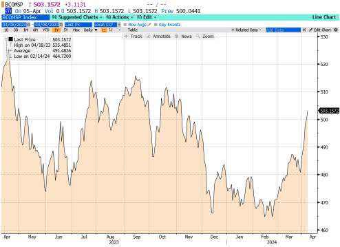 After spending much of this year making bets that were much more dovish than those of Fed officials, investors have now flipped in the opposite direction. They’re forecasting about 65 basis points of rate reductions in 2024, compared to the 75 basis points signalled by the median estimate of projections released following the Fed’s March 19-20 meeting. At one stage, the probability of a 25-bps cut in June briefly dropped below 50% on Monday night.