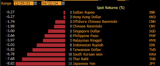 Other Asian currencies, like the Indian rupee plummeted to a record low against the dollar at 83.739 on Wednesday last week. Taiwan’s currency dropped to the lowest level in almost eight years this week. Malaysia issued verbal intervention last Monday, the MYR is trading at 26-year low. Seoul is “thoroughly” monitoring developments in the FX market with scenario-based response plans in place.