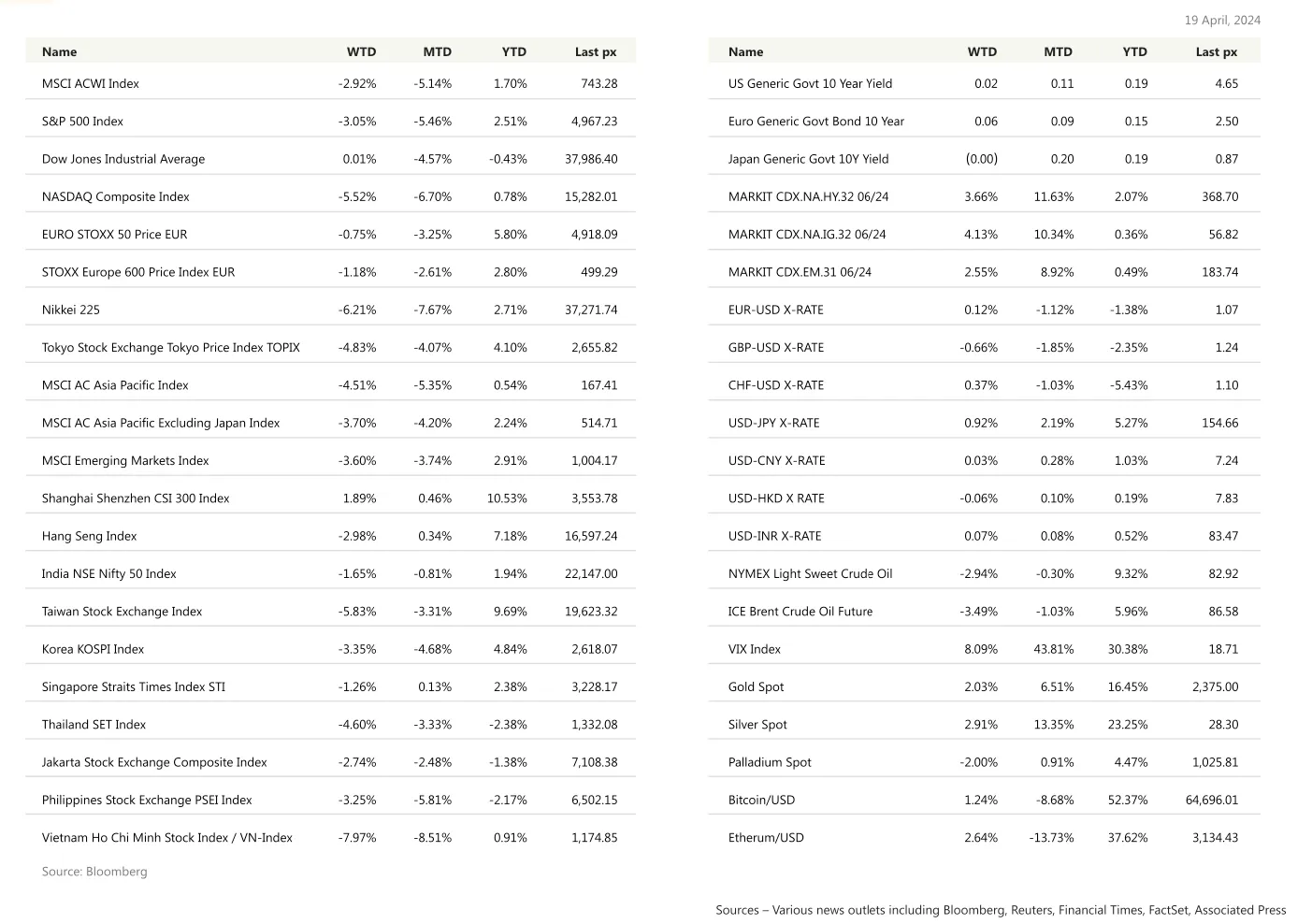 Sources – Various news outlets including Bloomberg, Reuters, Financial Times, FactSet, Associated Press