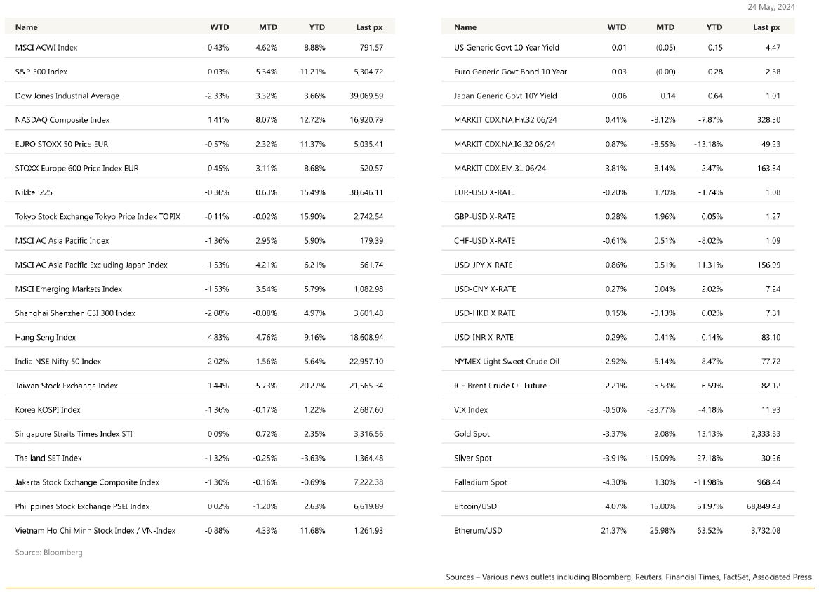 The S&P 500 closed flat for the week while the Nasdaq Composite advanced 1.4% and the Dow slumped 2.3%. US stocks gained on Friday on low volumes, following a slow, down-start after data showed that US consumers tempered their inflation expectations toward the end of the month, boosting hopes on the outlook for rate cuts later this year. University of Michigan data showed consumers anticipated prices will grow at a 3.3% annual rate over next year versus 3.5% expected earlier in the month. US markets will be closed on Monday in observation of Memorial Day. Data out earlier on Thursday overshadowed the robust earnings season, as US business activity accelerated to at its fastest pace in some 2 years, stoking concerns about ongoing inflation pressures. The S&P Global US Manufacturing, Services and Composite PMI’s all came in higher than expected. US jobless claims fell by more than expected, posting the biggest back-to-back drop since September. Economists at Goldman Sachs Group Inc. pushed out their call for the Fed’s first rate cut to September from July amid those signs of ongoing economic strength. Still, sentiment remains upbeat, looking like another up month which would give the S&P 500 Index a gain of 4 out of 5 months for the year. Investment is expected to pick up even more as competition in AI innovations and applications heat up which would reinforce productivity gain. Nvidia delighted investors when it announced a 10-for-1 stock split earlier this week after reporting street-beating earnings and a positive outlook for the sector. The move may be the start of a trend, as several prominent tech companies trade at prices high enough to tip the scales toward similar splits, according to a note from Bank of America. Apple had its price target raised citing iPhone demand is turning the corner into an AI driven iPhone16 supercycle (Wedbush). Even Morgan Stanley’s Chief US economist Mike Wilson, the last of the biggest bear on Wall Street threw in the towel and turned bullish boosting his price target for the S&P 500 from 4,500 to 5,400 a 20% hike! JP Morgan’s Kolanovic another bear, held firm in his gloomy outlook on equities. It is becoming evidently clear that the G10 monetary easing cycle is broadening, following the recent moves by the SNB and the Swedish Riksbank with analysts now expecting the ECB, the BOE and the Bank of Canada to follow suit in June. The pace of easing is likely to be gradual as wages are still growing faster than implied by central bank targets. Minutes from the last FOMC meeting unsurprisingly showed officials aligned with one another on their desires to keep interest rates elevated. Fed officials said that policy was “well positioned” and even noted that some were willing to tighten further if needed. Fed’s Waller said he needs to see “several more” months of good inflation figures to begin interest rate cuts. That’s cutting it fine before November’s elections. This coming shortened week will see the PCE Deflator release on Friday where Bloomberg is expecting both the MoM and YoY core to come in unchanged at 0.3% and 2.7% respectively. We will also have personal income & spending to contend with. Crypto-linked stocks traded higher on Friday after the Securities and Exchange Commission paved the way for spot-Ether exchange traded funds. Ether trades at $3,800 and BTC at $69,000.