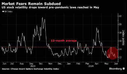 The dot plot, at Thursday’s FOMC meeting showed a median forecast on only one rate cut this year (from three in March) but four next year (up from three). While leaving the door open to an earlier cut if inflation keeps declining, the Fed appears willing to move cautiously given the uncertain inflation outlook and still, resilient economic conditions. The main drivers for market gains, expectedly, were big tech stocks. Stocks fluctuated between gains and losses during the regular trading sessions as traders assessed optimism that easing inflationary pressures will allow the Federal Reserve to cut interest rates, while also being concerned that a slowdown in growth could dampen the profit outlook. The consensus is that either ways, cuts could be on their way. The VIX remained subdued remaining below its average over the past 12 months: