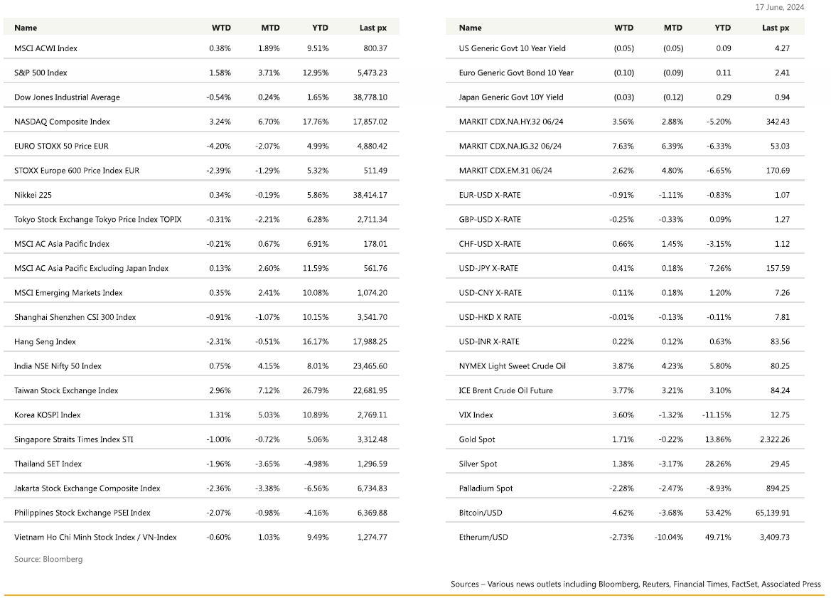 Both the CPI and the PPI for May came in softer-than expected. Although the dis-inflation trend appears to have resumed, Fed policymakers stressed the need for more evidence of downward momentum before commencing their easing cycle. Core CPI month on month came in at 0.2% and headline year on year CPI was at 3.3%, both below expectations. The core consumer price index cooled to the slowest pace in some three years. PPI followed the same path, with the Final Demand YoY coming in at 2.2% versus 2.5% expected. Weekly initial and continuous claims both came in higher than expected, underpinning potentially, a slowdown in employment. The Fed’s quarterly growth and inflation projections were marginally unchanged but preliminary US consumer sentiment reading of 65.6 fell to a seven-month low. The U. of Mich. 1-year inflation forecast struck 3.3%, while the 5-10 year inflation projection ticked-up to 3.1% in June, both coming in higher than expected. A better than expected Treasury auction during the week and safe-haven buying saw UST 10s and 2’s yields dip to 4.25% and 4.70% respectively.