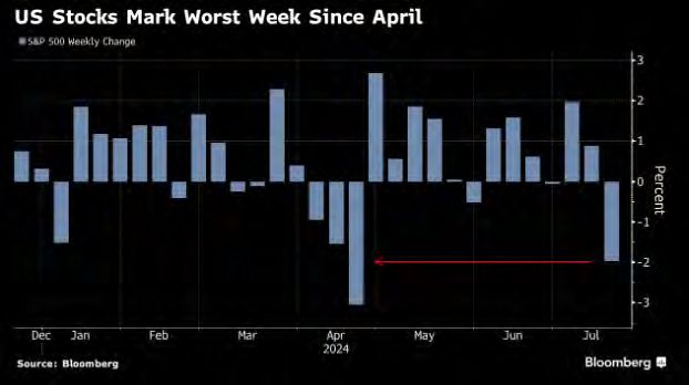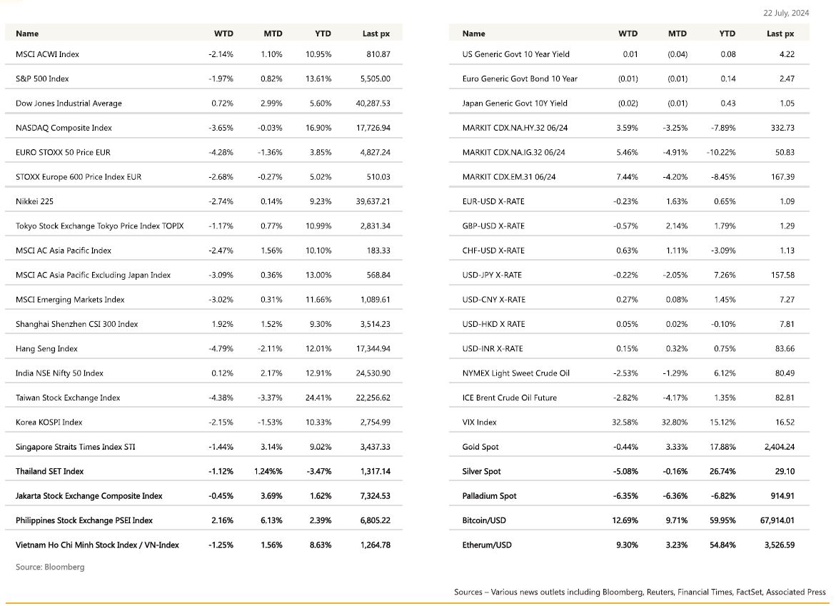 As they say, a correction is always healthy and that’s exactly what we got for the week. The S&P 500 fell about 2% marking its worst week in 3 months. Friday night capped off a third straight decline, roiled by uncertainty related to the US Presidential election, continued geopolitical angst and an unprecedented global tech outage. In an almost life imitating art scene from a movie on Friday, businesses and public services from Australia through to the US were disrupted after CrowdStrike Holding’s Falcon Sensor threat-monitoring service caused Microsoft’s Windows operating system to crash. These then coincided with disruptions of MSFT’s Azure cloud and 365 office services. Tech stocks were already declining prior to the outage, the Nasdaq having its worst day in 19 months Wednesday, amid a growing risk of tougher trade restrictions on semiconductors.