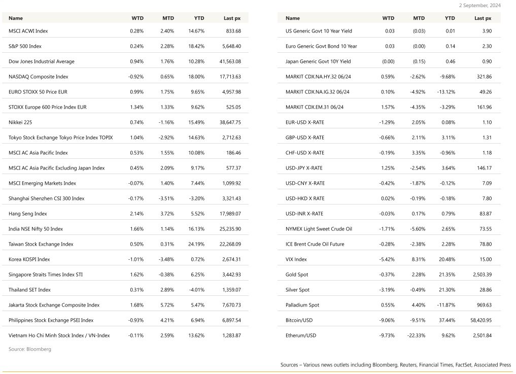 Trading in stock options shows that investors are positioning for gains after August’s wobble. The disinflation train continued with the U. of Mich. 1 Yr inflation expectation falling to 2.8% from2.9% whilst the 5-year outlook remained unchanged at 3%. This week will be a shortened week with markets closed tonight in observance of Labour Day. Key data to look out for will be ISM data on Tuesday, JOLTS on Wednesday, ADP Employment Change on Thursday, and the highly volatile non-farm payrolls on Friday. Bloomberg expects a +165k change and a drop in the unemployment rate to 4.2% from 4.3%. The $ was a tad stronger across the board and the yield curve bull steepened marginally with UST10’s closing at 3.90% and the 2’s at 3.916%.