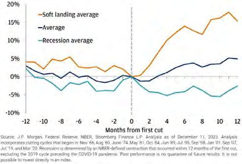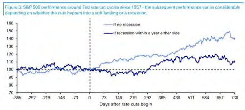 S&P 500 performance around Fed rate cut cycles since 1957 – the subsequent performance varies considerably depending on whether the cuts happen into a soft landing or a recession