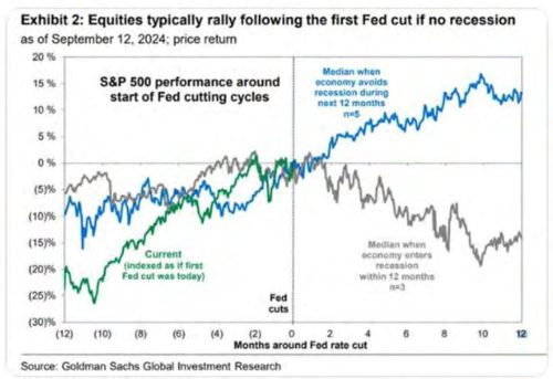 Equities typically rally following the first Fed cut if no recession as of September 12, 2024; price return