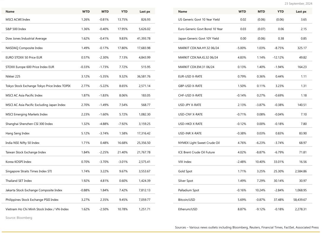 The long-awaited slash in rates finally happened, and in a flash a half percent was cut in the Fed Funds rate. A vote of confidence that inflation is now under control but the central bank cited risks to the labour market in its rate cut announcement, saying it was committed to the goal of full employment culled the market’s celebration Thursday. Another 50 basis points of cuts by the end of the year are expected, followed by 100 basis points in cuts next year, was enough to send all 3 major indices to close up circa 1.5%. US stocks notched its 2nd straight weekly gain despite a slight Friday night retreat. Profit taking was blamed for it, when a triple-witching options expiry and warnings of an overextended equity rally weighed on investor sentiment. Still, the S&P hit a new record on Thursday at 5713.64 and the VIX fell to 16.15. The UST2 and 10’s closed at 3.591% and 3.741% respectively, the steepest since June of 2022.