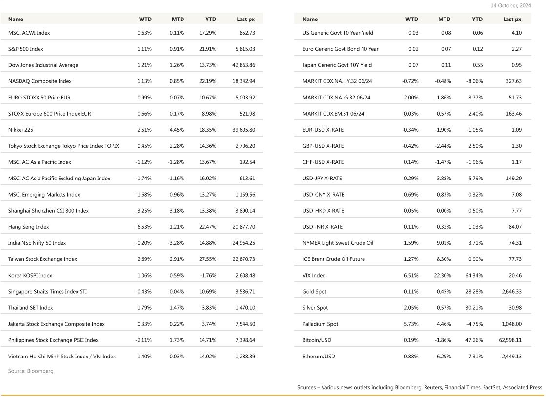US markets closed at a new all-time high on Friday as encouraging early earnings reports from major US banks and fresh inflation numbers allayed concerns about the Fed’s easing cycle. The S&P 500 hit its 45th record high this year with 9 out of the 11 sectors advancing, led mainly by financials and industrials. Also worth noting here that both the Russell 2000 and the equal-weighted S&P 500 were both outperforming suggesting that the rally is widespread and not concentrated to only the large/mega caps. After Thursday’s slightly higher than expected CPI releases, Friday’s PPI releases helped sooth some anxiety as the latter suggested further progress toward tamer inflation. Headline CPI came in at 2.4% against expectations of 2.3% whilst the month-on-month core CPI came in at 0.3%, also higher than expected by 10 bps. The PPI Final Demand was lower than expected at 0% from 0.2% previously. Unemployment claims both came in higher than forecast. Expectations remain that the Fed will reduce rates by 25 bps in the remaining 2 Fed meetings in November and December.