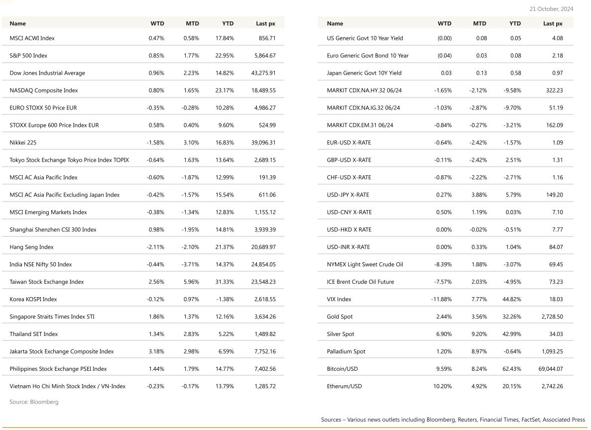 US markets posted a 6 consecutive weekly rally – its longest winning streak of 2024 fuelled by upbeat earnings and economic data supporting a robust economy. Earnings from Apple and Netflix following in the footsteps of Morgan Stanley, Goldmans, JP Morgan and Citi earlier in the week, all beating consensus. Chip giant TSM raised its revenue outlook, helping ease concerns about global chip demand and the sustainability of an AI hardware boom. The tech heavy Nasdaq 100 Index posted its worst day earlier in the week after Dutch semi producer ASML Holding NV plunged on lower guidance for 2025. Retail sales, illustrating resilient consumer spending, rose 0.4% MoM versus expectations of 0.3%, and ex-vehicles rose 0.5% versus 0.1% expected, driving traders further to trim bets on the scale of rate cuts to come. Applications for unemployment benefits fell after jumping the previous week in Southeastern states affected by Hurricane Helene, and data will probably remain volatile in the coming weeks. US import prices fell a little more rapidly last month due to lower fuel costs as oil prices sank. Meanwhile, mortgage applications in the US fell 17% in the last week, the biggest drop since 2020. The CBOE Vix index fell to 18 whilst the UST10Y and 2Y yields closed at 4.8% and 3.948% respectively steepening slightly from earlier in the week. Crude oil fell for the week to close below WTI $70 after the Washington Post reported that Israel may avoid targeting Iran’s crude infrastructure.