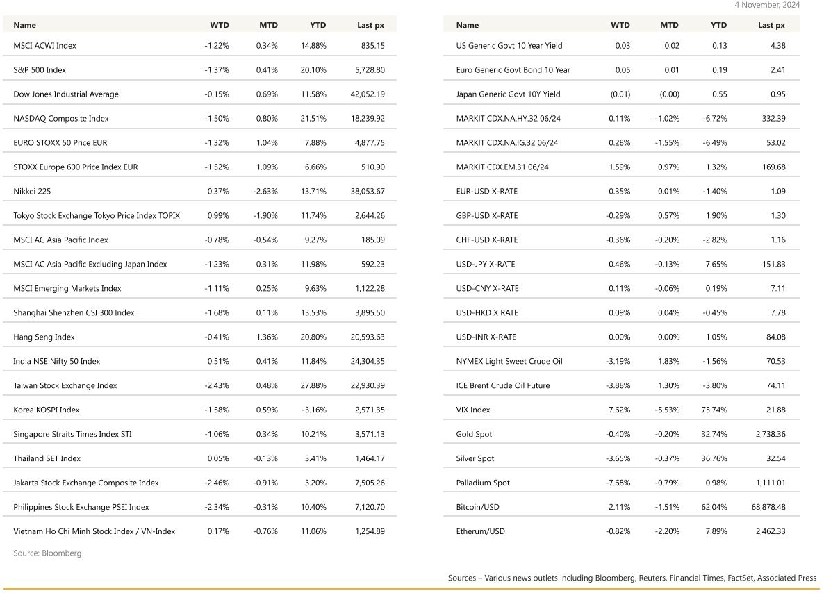 ‘tis the week of the US election. Markets closed down about 1.5% for the week and closing down about half a percent for the month. Earnings from tech giants Meta and Microsoft reported earnings that failed to impress. High expectations and lofty valuations for the “Magnificent Seven” tech megacaps — which account for a big part of the S&P 500 earnings growth — meant that sentiment can easily be dented, as seen on late Thursday. Questions over corporate profits keep mounting, with the US presidential election also clouding the outlook on taxes and tariffs. The Federal Reserve’s preferred measure of underlying US inflation posted its biggest monthly gain since April, prompting investors to dial back bets for how aggressively officials will cut interest rates. Core personal consumption expenditures price index, which strips out volatile food and energy items, increased 0.3% in September, and 2.7% from a year earlier, according to Bureau of Economic Analysis data. US jobless claims decreased by 12,000 to 216,000 in the week ended Oct. 26 to their lowest since May, as the impact of recent hurricanes started to fade. The impending US election and rising bond yields are also keeping investors on their toes, yet beyond a potential brief burst of volatility, there’s growing conviction that the rally has room to run. UST10Y and 2Y yields closer higher at 4.38% and 4.205% respectively, steepening for the week. Friday’s non-farm payrolls came in at a much weaker than expected 12k jobs vs expectations of 100k with the unemployment rate unchanged at 4.1%. Average hourly earnings rose 0.4% from September – higher than expected. Markets staged a late rally parsing a wave of earnings readouts from Amazon, Intel and Apple and cementing bets that the Fed will continue to be on track with its rate cuts. Data from earlier in the week saw the US economy expanding at a relatively robust pace in Q3, with inflation-adjusted gross domestic product increasing at a 2.8% annualized pace after rising 3% in the previous quarter. A soft landing is still the Fed’s position.