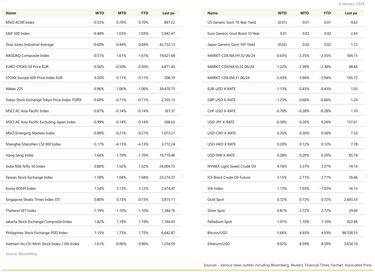 Singapore’s 2024 GDP growth beats expectations, expanding at 4.3% in Q4, taking full year growth to 4%. Singapore’s resilience could be tested by offshore factors ranging from China’s slowdown to trade tensions stirred by the incoming Trump administration and other geopolitical fissures. The government didn’t provide an outlook for 2025 growth. Singapore is not immune from these global mood shifts and pressures, Prime Minister Wong said on Dec. 31. Still, we remain a beacon of safety, security and stability in a troubled world.”