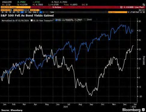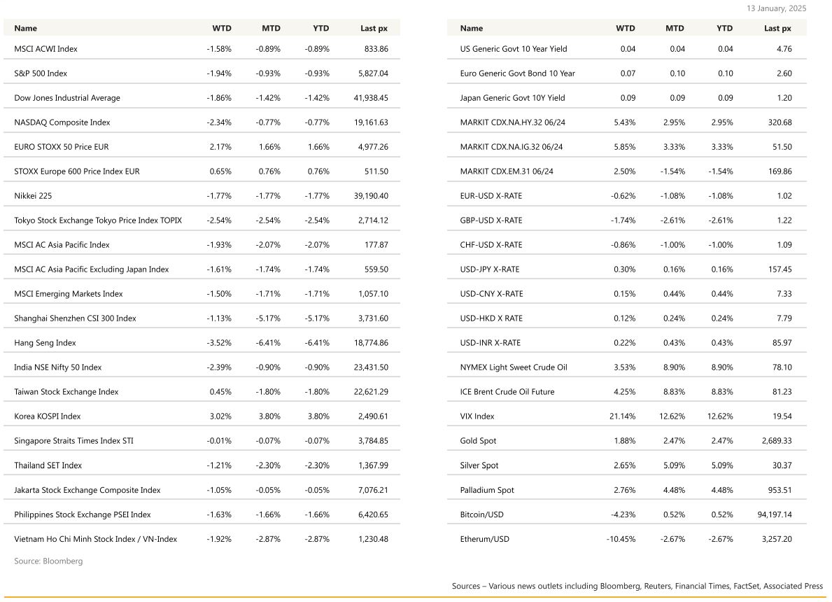 The VIX flirted with 20, a level that starts to raise concerns for traders. In addition, the threat of tariffs from Presidentelect Donald Trump has raised worries about possible upward pressure on inflation, which has remained above the Fed’s 2% target. Analysts from Bank of America who previously expected 2 cuts no longer expects any this year. Whilst seeming extreme to revise based off one volatile number, it was enough to dampen sentiment. UST10 year yield closed at 4.759% and the 2’s at 4.379%.