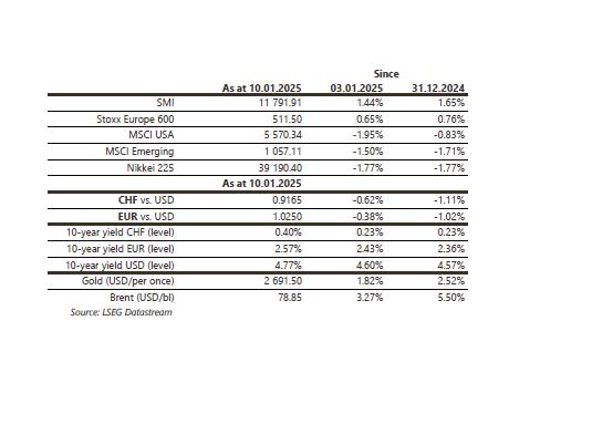 Good economic figures in the US pushed up 10-year sovereign yields, by around 16bp in USD, EUR and even CHF. Equities suffered in the US (-1.9%) and emerging markets (-1.5%), but not in Europe (+0.7%) or Switzerland (+1.4%). The dollar index continued to appreciate (+0.6%), without penalizing gold (+1.8%). Oil prices rebound by 3.3% following new US sanctions against Russian exports. Coming up this week: confidence of SMEs (NFIB index) and homebuilder’s (NAHB index), consumer price index, retail sales, industrial production, housing starts and building permits in the United States; industrial production and trade balance in the eurozone; Q4 GDP, retail sales, industrial production and investments in China.