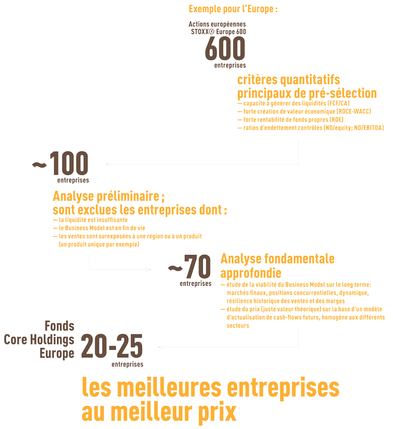 Sa méthodologie, dénommée Core Holdings a pour objectifs d’analyser et de retenir les entreprises (européennes, suisses ou américaines) dans
